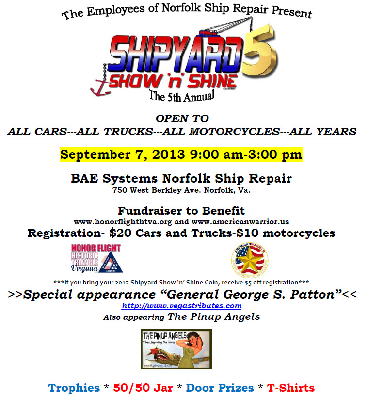 End the summer with a beautiful day outside enjoying a creative and historical display of the automotive industry at BAE Norfolk Ship Repair! The event is free to spectators, register vehicles at ed.ketz@baesystems.com All proceeds benefit HonorFlightVA.org